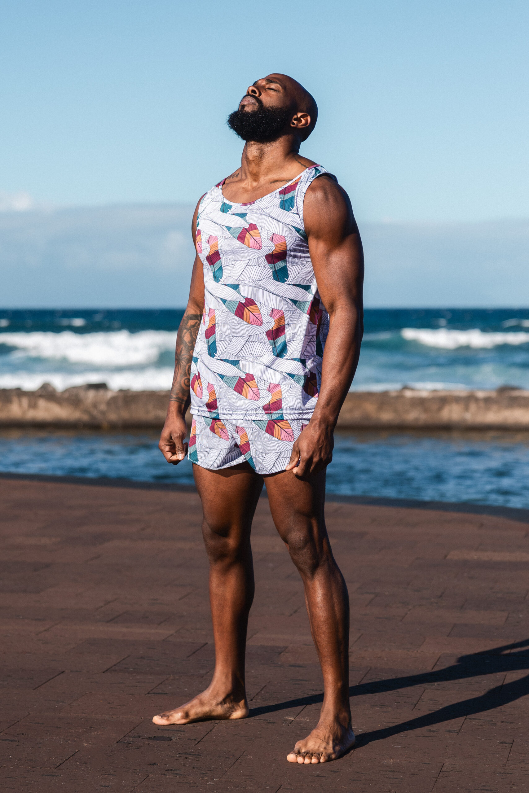 Camisilla en fondo blanco con estampado de plumas con un color tropical en rosa, naranja y azul, corte holgado y fresco, tejido técnico ideal para la playa o combinarlo con short a juego.